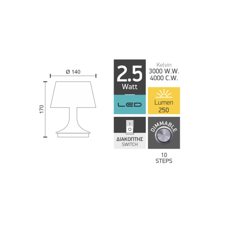 Μοντέρνο φωτιστικό γραφείου με ενσωματωμένο LED, κατασκευασμένο από πλαστικό σε λευκό χρώμα. Το φωτιστικό διαθέτει ενσωματωμένη μπαταρία, με χρόνο φόρτισης max 8 ώρες. Διαθέτει τηλεκοντρόλ με εμβέλεια 3-5 μέτρα. Διαθέτει διακόπτη ΟΝ/OFF & επιλογή χρώματος φωτισμού 3000Κ-4000Κ. Η κατανάλωση της φωτεινής πηγής είναι στα 2.5Watt.
