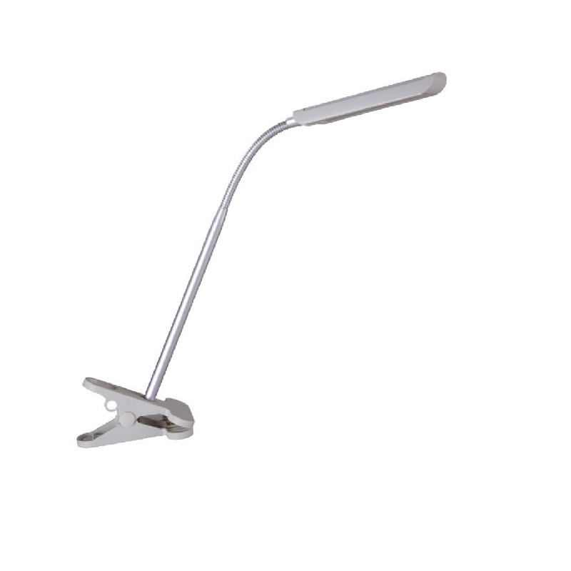 Μοντέρνο φωτιστικό γραφείου με ενσωματωμένο LED και κλιπ, κατασκευασμένο από πλαστικό σε γκρι χρώμα. Το φωτιστικό διαθέτει πλήκτρο ΟΝ/OFF. Η κατανάλωση της φωτεινής πηγής είναι στα 5W με θερμοκρασία χρώματος 4000Κ φυσικό λευκό.